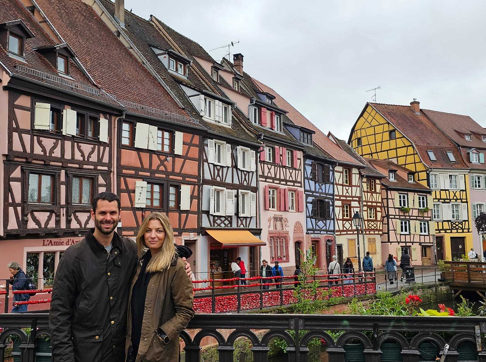 Al día siguiente tomamos el tren rumbo a Colmar. La estación estaba muy cerca del hotel, así que pudimos caminar tranquilamente con nuestras maletas y subirnos al tren sin complicaciones. El trayecto dura alrededor de una hora, y a medida que avanzábamos, sentíamos que nos acercábamos a un lugar especial. Y no nos equivocamos: Colmar, uno de los pueblos más famosos de Alsacia, es —al menos para mí— el más encantador de todos.